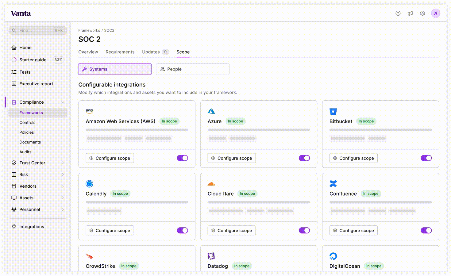 We run your Compliance Management Program on automated trust management platform, integrating it with your cloud services, identity platform, and endpoint tooling to automate evidence collection and continuously monitor controls across ISO 27001, Essential Eight and other frameworks. Hundreds of integrations and thousands of automated tests keep your environment audit-ready, while CyberOps interprets the findings, closes gaps, and steers your certification and ongoing assurance program.